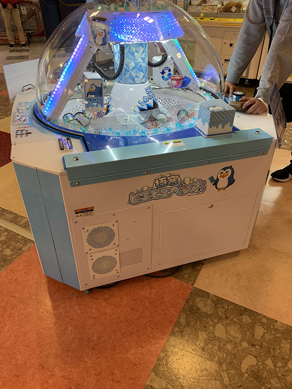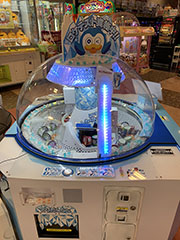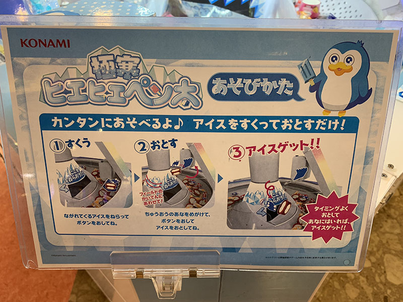 ◆コナミ新作プライズゲーム機『極寒ヒエヒエペン太』、神戸「遊スペース・アローズ」でロケテスト開催中(開催期間未定)![]() ![]() ![]() ![]() ![]() ![]() 2001年、アイスクリームを景品として提供できるプライズゲーム機『ヒエヒエペン太』をリリースしました。あれから17年、遂に最新作が登場しました。ロケテスト開催の話を聞き10月27日(土)、実際に現地へ足を運んでプレイしました。 旧バージョン同様、同時に2人までプレイできます。クレジットは、100円1プレイ。300円4プレイと、1プレイお得です。 遊び方は下記の通りです。アイスをすくうところは変わりませんが、旧バージョンと違ってすくったアイスをもう1回ボタンを押してタイミング良く穴の中に入れます。