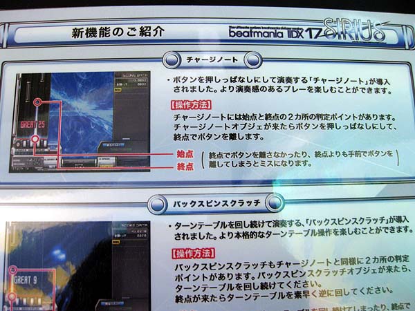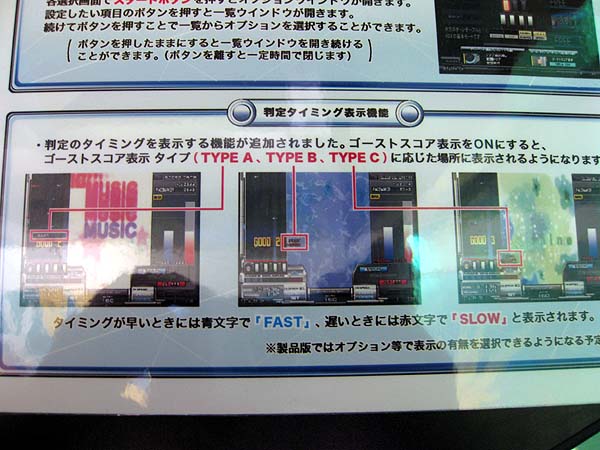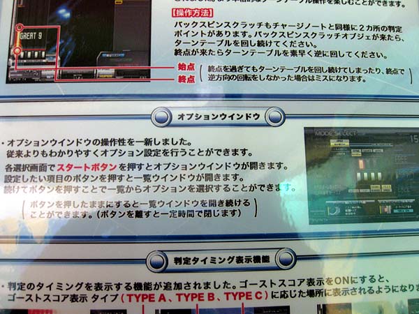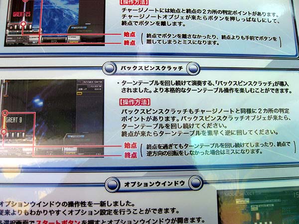 ◆新しく追加された仕様について1. チャージノート 過去にリリースされた『キーボードマニア』に存在したオブジェに近い形で、オブジェクトの範囲内で押しっぱなしにして終端で離します。押しっぱなしはミスとなります。 2. バックスピンスクラッチ オブジェクトの範囲内でスクラッチを回し続け、終端で逆方向に回します。 3. オプションウインドウの操作性変更 オプションウインドウが開いた後、設定したい項目のボタンを押すと選択できるオプション項目が一覧となって表示されます。 4. 判定タイミング表示機能 ゴーストスコア表示をONにすると、スコア表示のそばに判定タイミングが表示されます。タイミングが早いときは青文字で「FAST」、タイミングが遅いときは赤文字で「SLOW」と表示されます。製品版では、オプション等で表示の有無を選択できる予定のようです。 ◆新曲リストぷろとらどっとこむ様・ミーヤの屋根裏部屋様・BEMANIWiKiを参照にまとめました。