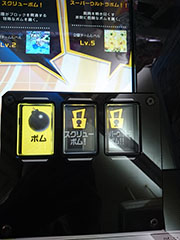 左側に操作レバー。右側にボムを置くボタン・スキルボタン2つ、合計3つのボタンが付いています。ボタンの形はですが、JAEPOバージョンでは正方形のボタンでしたが、4月のロケテストでは長方形のボタンになっていました。