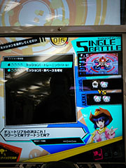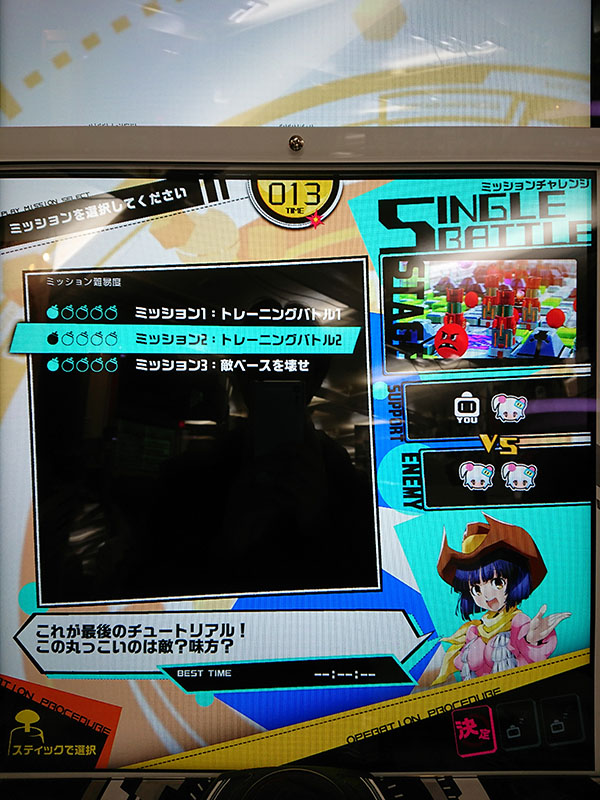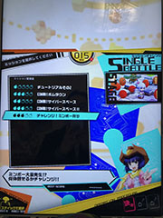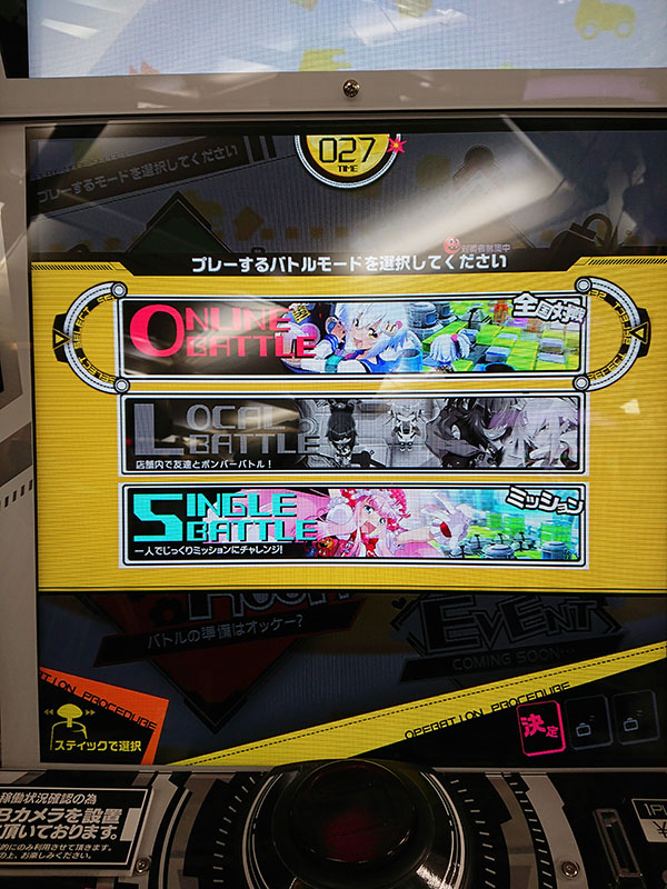 ボンバーガールのメインモードです。全国対戦の「オンラインバトル」、一人でじっくりミッションにチャレンジできる「シングルバトル」の2つのモードが選択できました。店内対戦の「ローカルバトル」は、今回のロケテストバージョンでは選択できませんでした。 |