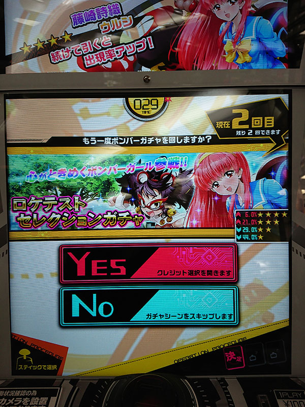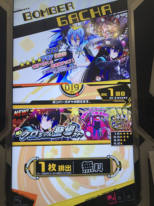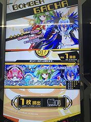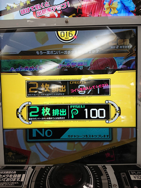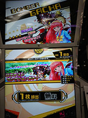 ボンバーガチャです。1回目は無料ですが、1枚排出。2回目以降はクレジット投入必要ですが、2枚排出されます。ガチャは計4回まわすことができるので、有料分は3回になります。