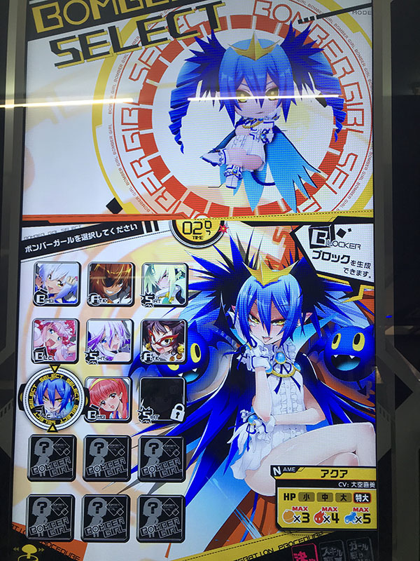 JAPEOで使用できた「ツガル」と、3月2日からJAEPOで発表された「アクア」が使用できるようになりました。3月16日からのロケテストでは、同じくJAEPOで発表された「クロ」が使用できるようになりました。キャラクターを使用するには、ゲーム終了後の「ボンバーガチャ」で手に入れる必要があります。