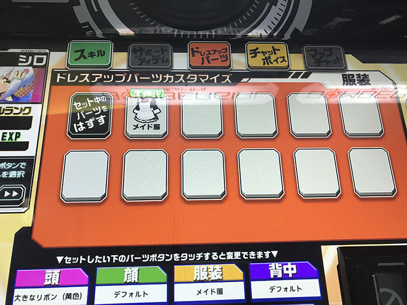 また、ガールズの衣装が変更できるようになりました。衣装のドレスアップパーツも「ボンバーガチャ」で手に入ります。ドレスアップは、対戦中のガールズの衣装にもしっかり反映されます。