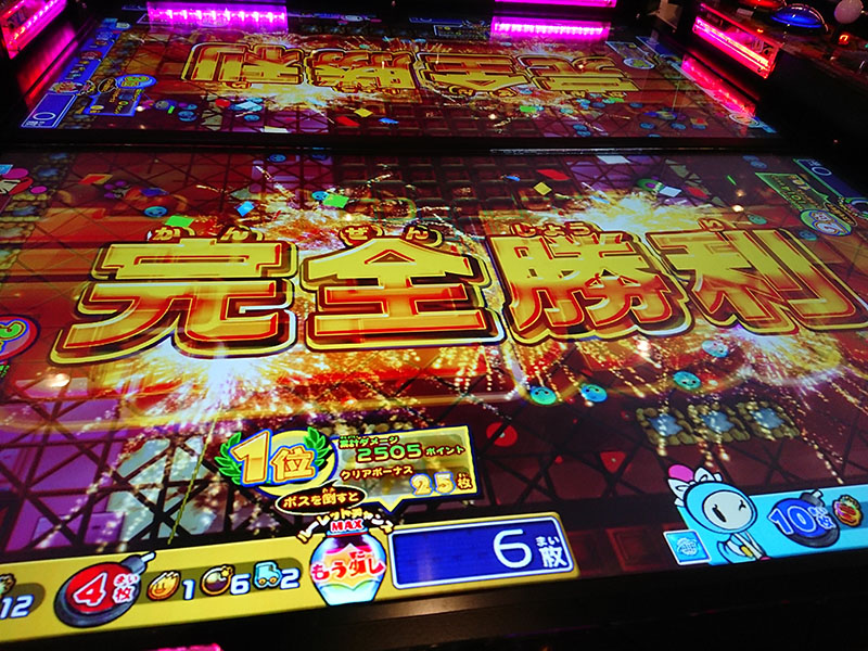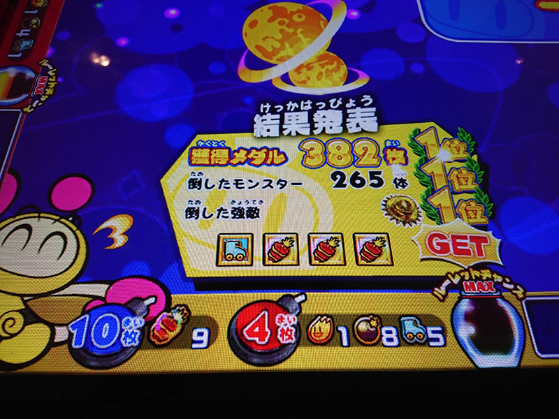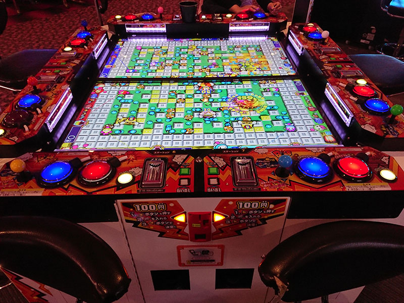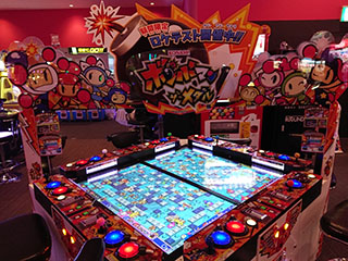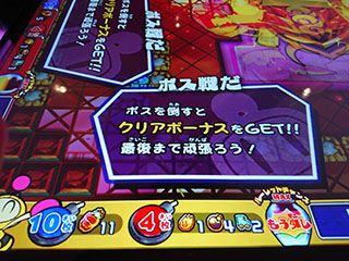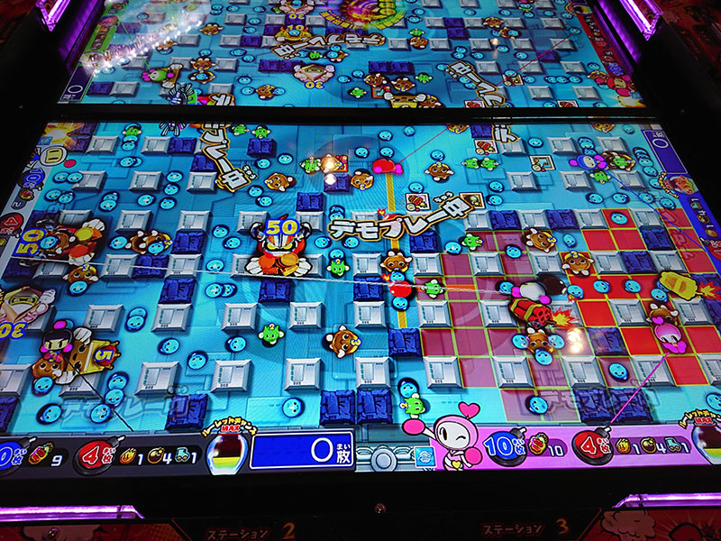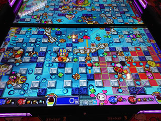 筐体は全部で8サテライト用意されていて、最大8人まで同時にプレイできます。爆弾を置くとメダルを消費します。モンスターを倒すとメダルをゲットでき、強いモンスターを倒すと多くのメダルをゲットできます。一定条件を満たすとボス戦に突入し、他のプレーヤーと協力してボスを倒します。
