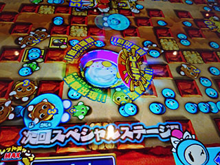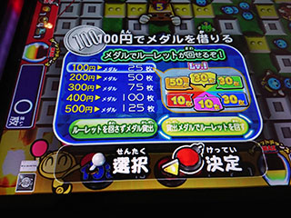 - メダルを投入します。もしくは、100円を入れてメダルを借りることも可能です。100円25枚から、500円125枚まで借りることができます。コインでメダルを借りた場合、スペシャルルーレットをまわすことができます。