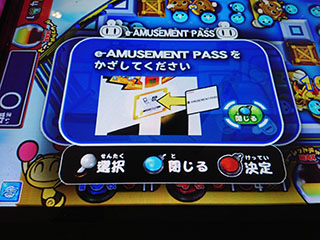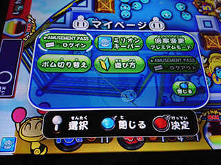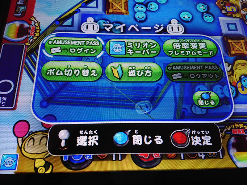 ゲーム中に筐体に付いている「メニューボタン」を押すと、「マイページ」画面に切り替わります。「マイページ」ではe-AMUSEMENT PASSログイン・ログアウト、遊び方の確認、ボム切り替え、ボムの倍率変更、ミリオンキーパーからのメダル預け払い、ができます。