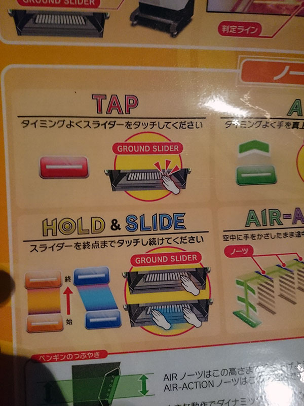 空間センサー「AIR STRINGS(エアーストリングス)」は、筐体の左右に付いているセンサーが腕の位置を検知して、タップしてから腕を上げたり空中で手を下ろす動作を実現できるデバイスです。オードソックスにノーツをタッチし続けてから腕を上げる動作もあれば、左右にスライドし続けてから腕を上げる動作、タップしたらすぐ腕を上げる動作等、様々なバリエーションがありました。