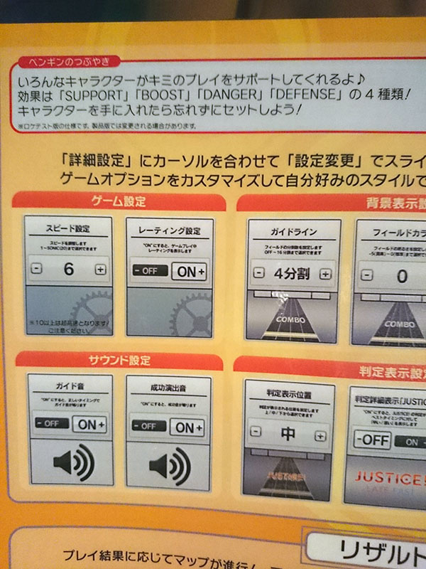 - 判定詳細表示JUSTICE:ONにすると、JUSTICEの判定がベストタイミングに対して「早い/遅い」を表示します。