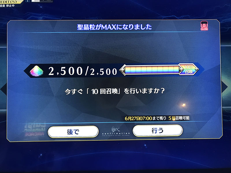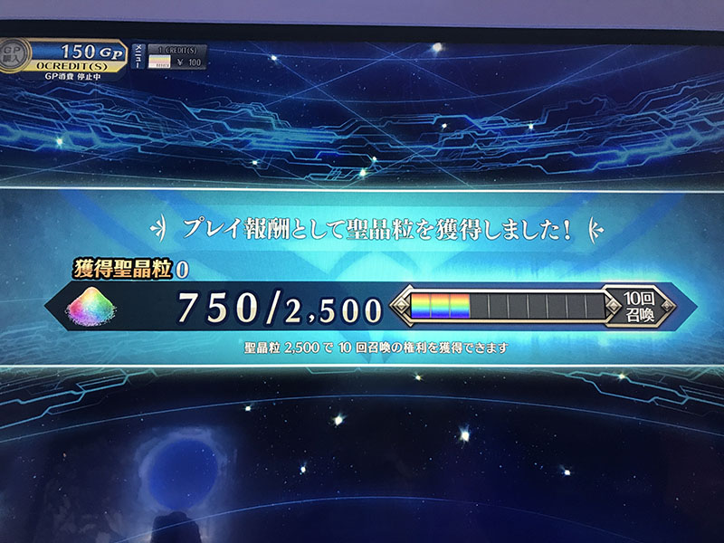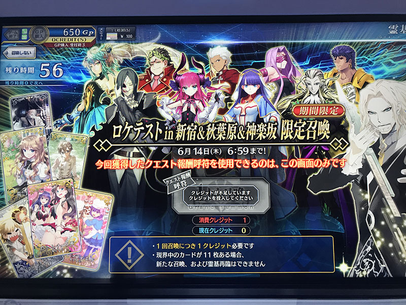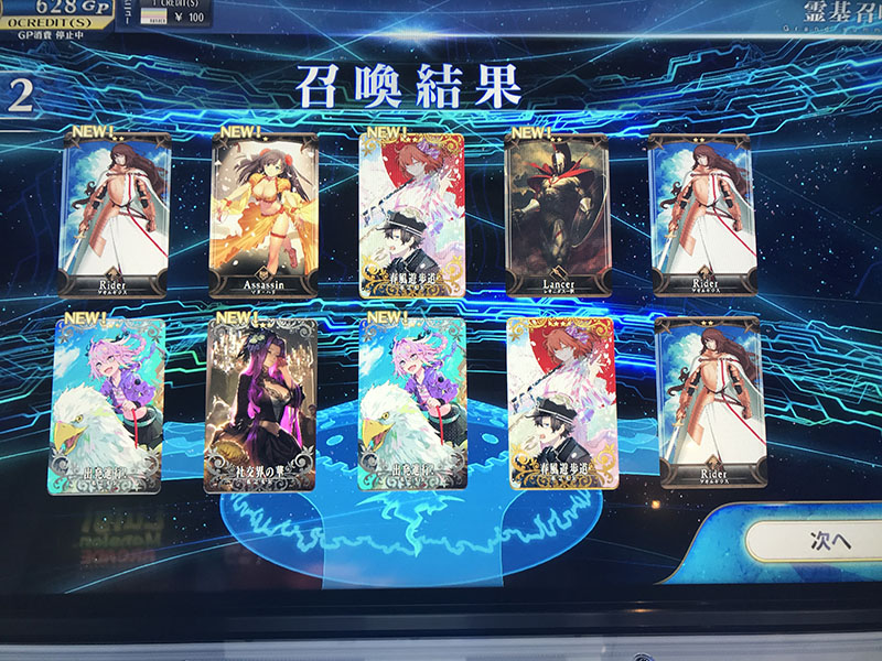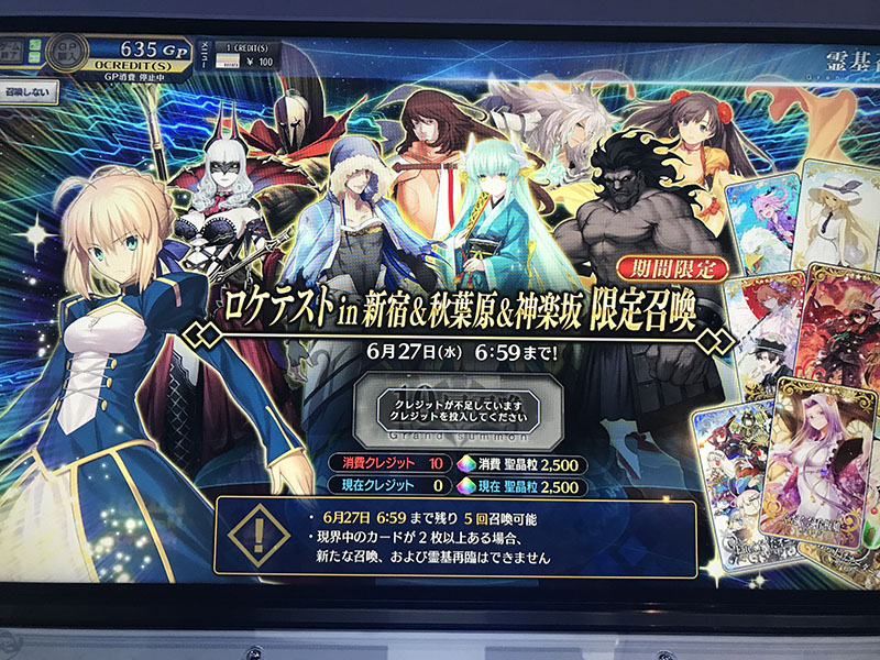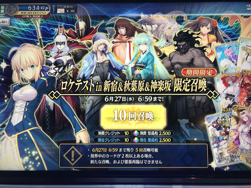 2018年6月25日 | 1回プレイ ・セガ秋葉原3号館でプレイ ・300円、900GP購入でプレイ ・10回召喚(10連ガチャ)で1000円使用 ・対戦後の召喚(ガチャ)で300円使用 ・合計1,600円使用 |
