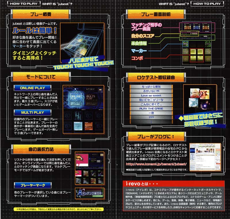 ◆e-Amusement PASSを使ってプレイしたときの流れ(08年2月ロケテ-バージョンから追加)最初に、プレーヤーの名前を入力します。入力後、「チュートリアルモード」がスタートします。2回目以降のプレイから、「チュートリアル」は出なくなります。 曲選択画面では、クリアした曲には「マーク」がつきます。もちろん、難易度ごとにマークがつきます。また、上の画面を見るとプレイした曲に関しては最高スコアと最高判定が表示されます。 プレイ終了後、各ステージでプレイした曲の成績に応じてポイントが加算され、一定以上ポイントがたまるとプレーヤーのランクが上昇します。ランクは「D」からスタートし、現時点では「C4」→「C3」→「C2」→「C1」まで確認できました。獲得ポイントは「レーティング」、「難度」、「初プレー」、「初クリア」の4つの項目の加算した数字になります。全国ランキング表示もあり、おそらく獲得ポイントごとで集計しているものと思われます。 ランクが上がると、複数用意されているアイテムの中から1つ選択して獲得できます。今回は、新曲「Polaris」と称号(3つ?4つ?)が手に入りました。 ◆ゲームの流れモードは「オンラインプレー」と「マルチプレー」の2種類用意されています。「オンラインプレー」は、ネットワーク上で同じ曲を選んだ人同士で一緒にプレーします。最大3曲プレーで、スコアが70万点以下はゲームオーバーになります。相手のプレーヤーとの勝敗は、特にゲームを継続プレイするという点においては関係ありません。「マルチプレー」は、同店舗内対戦になります。3曲までゲームオーバーなしでプレイできます。 曲選択は、下のボタンで選択します。ボタンに曲のCDジャケットが表示されていて、上の画面には曲名と難易度が表示されています。今回のバージョンは、全21曲収録。うちコナミオリジナル曲は1曲のみで後はすべて版権曲です。版権曲は、アーティスト表示があるものとないものがあります。アーティスト表示がないものは、カバーと思われます(天体観測とか全力少年など他の音ゲーに収録されている曲は、同じカバーものでした)。コナミオリジナル曲については、アーティスト表記はありませんでした。 曲選択画面には「設定変更」というのがあります。これをタッチすると、難易度・エフェクト変更・称号変更ができます。難易度は、「BASIC・ADVANCE・EXTREME」の3種類から選択できます。エフェクト変更は、プレー中のボタンを叩いたときのエフェクトを変更できます。ロケテストバージョンは、全部で8個のエフェクトが用意されていました。称号変更は、プレーヤーの称号を変更できます。プレーヤー名のところにいっしょに称号が表示されます。ロケテストバージョンでは、11個の称号が用意されていました。 プレー画面は、上の小型モニターにスコア表示・コンボ表示・曲名・難易度が表示されます。下のボタンはコンボを続けると、真ん中のパネルに大きくコンボ数が表示されます。上にも書きましたが、「TOUCH」表示が出たパネルを叩きます。ボタンに突然浮かび上がってくる感じで表示されます。曲のスピードによって、「TOUCH」表示の速度も変化します。難易度が高くなると、4つ同時押しとか斜め同時押し、複雑な表示のしかたをしたりと、かなり歯ごたえが出てきます。 プレー結果がブログにアップされる、というのもこのゲームの特長です。「i-revo」会員になると、プレー結果がそのままブログにアップされます。もちろん、コメントをつけることも可能です。 ◆プレーしてみて何回かプレイしましたが、最初は「TOUCH」を叩くタイミングがうまくつかめませんでした。「TOUCH」表示が早いせいもあるのでしょうか?叩いたときのエフェクト表示で判定を表しているようで、判定はうまく叩けた状態と叩けない状態の2種類ではないかと思われます。何度かプレイするとうまく叩くタイミングもつかめるのですが、最初は難易度が低い曲でもうまく叩けなくてスコアが伸びずゲームオーバーになりました。このへんについては、今後ブラッシュアップされると思います。 ◆ロケテストの様子23日の町田は、コナミスタッフが朝から4人いました。交代で対応していて、プレーした人にアンケートの回答(筐体となりにあるノートパソコンに入力)をお願いしたり、リーフレットを配布していました。 24日は、野崎プロデューサーの姿もありました。 ◆曲リスト07年12月バージョンでは、下記21曲が収録されていました。当時の難易度は最低がレベル1、最高でレベル8です。コナミオリジナル曲「Snow Goose」がボス曲的存在です。 08年2月バージョンでは、難易度がかなり変更されました。「→」後ろの数字は、2月バージョンの難易度です。また、AOUで追加された「A Perfect Sky」が収録。AOUで収録されていた「Polaris」は、未収録でした。