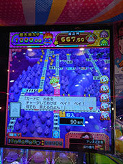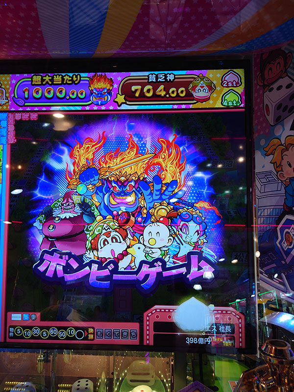 ■第1回(2022/8/11~8/21)川崎ロケテストより ![]() ■第2回(2022/8/26~9/4)藤沢ロケテストより ![]() ![]() ■第3回(2022/9/16~9/25)柏ロケテストより(撮影日:2022/9/18) ![]() 人気ボードゲーム『桃太郎電鉄』がメダルゲームで登場です。 ■ゲームの概要プッシャーフィールドからサイコロボールを落として、サイコロを振って目的地を目指します。目的地へ到着すると、大当たりが貰えるチャンス(メダル大量ゲットのチャンス)です。他にもメダル大量ゲットのチャンスは、物件を集めたときや貧乏神から逃れたときなど、いろんなところにあります。 家庭用桃太郎電鉄は複数人数で楽しむパーティーゲームでしたが、このメダルゲームの現時点の仕様では「1人で楽しむ」ゲームとなっています。「目的地到着」をみても各席ごとに異なっているため、他の人より早く「目的地へ到着」、というものではありませんでした。 ■2022年9月開催第3回柏ロケテストで確認できた新要素100円でゲーム内で使えるアイテムカードを獲得できるとのことです。■2022年8月開催第1回川崎ロケテストまとめ1. ゲーム機筐体(第1回2022年8月ロケテスト時)席は全部で4席ありました。席の正面には、大型モニターで各席のプレイ画面を映し出しています。モニターは、4Kモニターを使用しています。ゲーム再起動時に画面右上に「3840×2160」と解像度が表示されていましたので、4Kモニターと判断しました。モニターの大きさは、おそらく約50インチはあると思います。モニターの大きさは、beatmania IIDX LIGHTNINGモデルのモニターより大きかったので、40インチ以上はあると思いました。 各席のデバイス類は、「メダル投入方向切り替えボタン」と「メダル発射ボタン」が左右両脇にあります。他に「100円切り替えボタン」(100円を入れてメダルに変換するもの、今回は使用できませんでした)。e-Amusement PASSの読み取り箇所。「マイページメダル転送ボタン」。「払い出しボタン」。「メダル投入口」があります。 ![]() ![]() ![]() 2. ゲームのフロー『桃太郎電鉄』と同じと思って結構です。