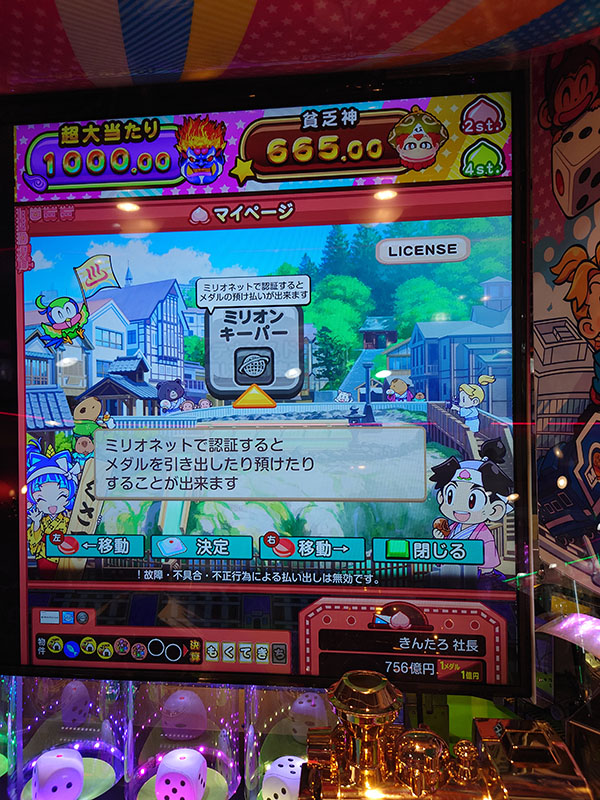 ![]() 4. 第1回ロケテスト(2022年8月川崎開催分)を振り返ってロケテスト初日の8月12日(金)、偶然「シルクハット川崎ダイス」へ足を運んだらメダルゲームスペースで見慣れないゲームが設置中でしたので、設置作業をほぼずっと見守っていました。8月12日ロケテスト初日の開始は14時40分頃でした。既に周りには、桃鉄をプレイしたいお客さんが集まっていて、なかには自身の荷物で場所取りをしている人もいました。ロケテスト開始後、あっという間に4席埋まってしまいました。 ロケテスト中はコナミスタッフさんがほぼ張りついて様子を見ていて、不具合等が発生したらすぐ対応していました。完成度はまだ低いと予想できますので、アクシデントは仕方ないと思います。 実際にプレイしたのは、8月16日(火)です。お店でメダルを1,000枚借りて始めました。最初はサイコロボールを落とすことに専念し、サイコロをまわしていろんなマス目に停まって報酬をゲットしたり物件を集めて報酬をもらったりと、その繰り返しでメダルを切らさないようにして目的地到着を待ちました。目的地に到着すれば大型報酬をゲットできるチャンスですし、目的地ボーナスでゲットできる「ボンビーボール」を落とせば貧乏神の妨害があるとはいえ、こちらも大型報酬を得るチャンスがあります。目的地にコンスタンスに到着できるようになると、大型報酬チャンスが続くので、メダルを切らすこともなく長い時間プレイできます。実際8月16日のプレイ時間は、約5時間プレイできました。 『桃太郎電鉄』というよく知られているコンテンツもあって、ゲーム機を見た人が反応している様子を何度もみることができました。今後もブラッシュアップされていくと思いますので、またロケテストが開催されたときは是非現地で確認したいです。 5. 第1回ロケテストプレイ動画参考までに、プレイの様子をスマホで撮影した動画をYoutubeにアップしました。 |