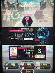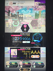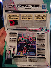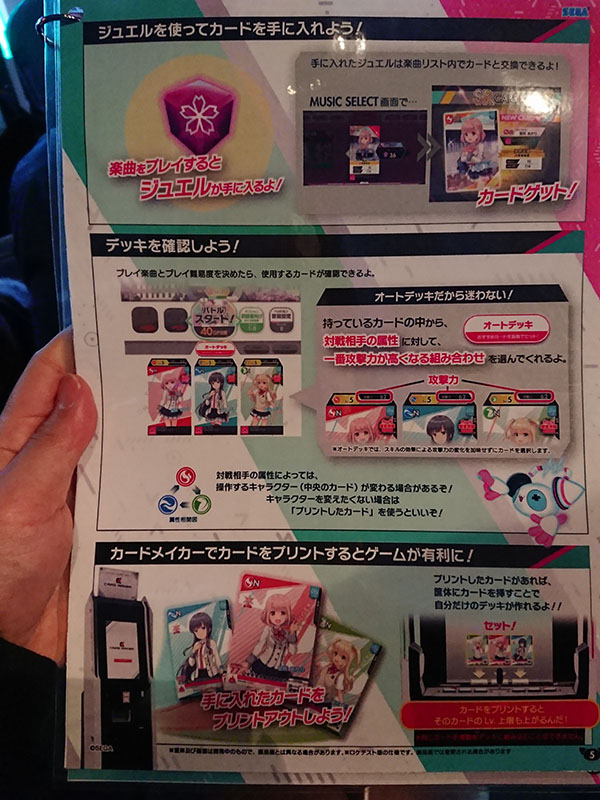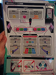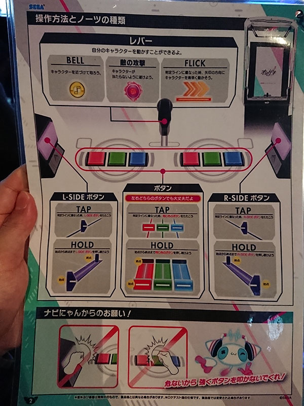 セガのmaimai・チュウニズムチームが制作した完全新作音楽ゲームです。リズムに合わせてタイミングよくノーツを叩くだけではなく、リズムに合わせて敵からの攻撃を避ける、といった従来の音楽ゲームの常識にとらわれない要素が入っています。 ■ゲーム概要についてリズムに合わせてノーツを叩くのはもちろんですが、リズムに合わせて敵からの攻撃を筐体についているレバーデバイスを使って左右へ避けます。ゲーム機筐体とは別に、ゲーム中に登場するキャラクターのカードを印刷するためのカードベンダーが別途用意されていて、プレイ後のデータを利用してカードを印刷することができます。■ゲーム機筐体についてゲーム機筐体の真ん中にレバーデバイスがついています。レバーデバイスは左右に動かすことができ、キャラクターを操作するのに使用します。レバーデバイスを動かしたときの反応ですが、やや重めな印象がありました。レバーデバイスをみて左右にそれぞれボタンが3つ付いています。このボタンは、ノーツを叩くときに使用します。筐体の左右をみると、サイドボタンが付いています。サイドボタンを叩いたり、押しっぱなしにする動作もあります。レバーデバイスの手前側には、カードをセットするための挿入口が3つ付いています。筐体手前側には、ヘッドホン端子が付いています。![]() ![]() ■ゲームの操作方法について現地にあったプレイングガイドに全般的な説明が掲載されていました。基本的には、ノーツを叩きつつ敵の攻撃を避けて、道中にあるBELL(黄)をとってライフを回復、という感じです。ライフがすべてなくなると、楽曲強制終了になります。![]() ![]() ![]() ![]() ![]() ![]() ■2018年おためし会時のゲームフローについて(2018年5月16日追記)