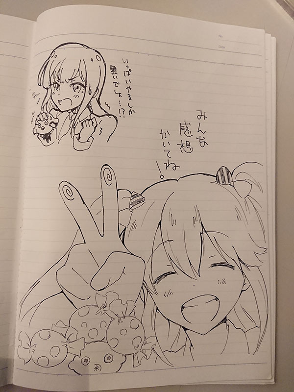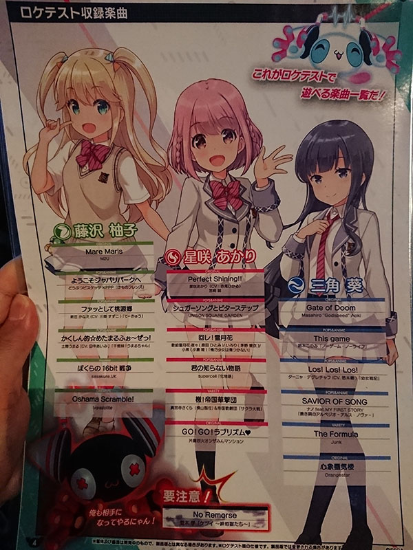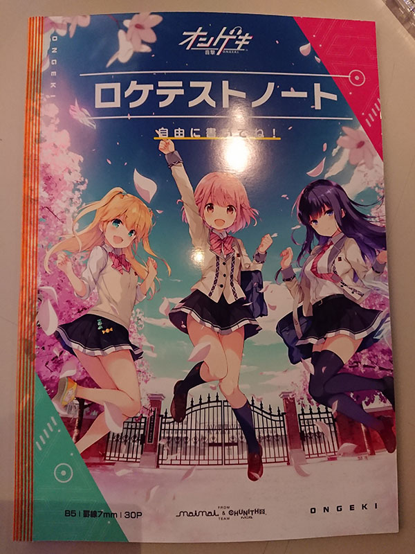 ■ロケテスト会場内にあった諸々のものゲームのご意見等を書き込めるロケテストノートです。ノートをめくると、イラストが!![]() ![]() ![]() ロケテスト会場内には、『オンゲキ』の設定資料が展示されていました。 ![]() ![]() ![]() ![]() ![]() ![]() ![]() ![]() ![]() 「私の夢プリメラ~」と書いてあったノートを拡大してみると、こんなふうに書かれていました。 ![]() ■2017年12月のロケテストを振り返ってみて12月15日~16日の2日間、開店前から並んで整理券をもらってプレイできました。初日は平日とはいえ、9時過ぎには40人を超えていて、初日からたくさんの人で盛り上がりました。2日目はさらに増えて、10時前で100人は超えていました。新しい音楽ゲームに期待している人が多いなぁ、ということを改めて実感しました。『オンゲキ』のプレイ動画だけみるとイマイチわかりにくい部分も、実際にプレイしてみると音楽ゲームをやっている、というのは実感できました。敵の攻撃を避ける、というシューティングゲームの要素がありますが、リズムと合っているのでやってみるとこれも音楽ゲームかな?、と思いました。タイミングよくボタンを叩く、ハイスピードをあげてノーツを見やすくする(ハイスピードを上げすぎると、敵の攻撃を避けるのが難しくなる)、といった音楽ゲームの常識を覆す要素が満載ですので、さらなるブラッシュアップを期待したいと思います。 ■2018年5月のおためし会を体験して(2018年5月16日追記)これまでのバージョンと比較して、敵の攻撃を避ける要素(弾から逃げる)が少なくなり、ボタンを叩く音ゲーとしての動作が増えました。操作面は、難易度がEXPERTまでは片手でレバーを操作してもう片方でボタンを叩く動作で十分対応可能です。難易度がMASTERになると、レバーから手を離して両方の手を利用してボタンを叩く動作が要求されます。両方の手を使いつつも、レバーを使ってキャラクターを操作したり壁のボタンを叩いたりと、かなり忙しくなります。難易度が上がったらといって単純に叩くボタンが増えるのではなく、『オンゲキ』ならではの操作感を十二分に追求した譜面構成になっており、今までにない音ゲーの操作感を体感できました。 |