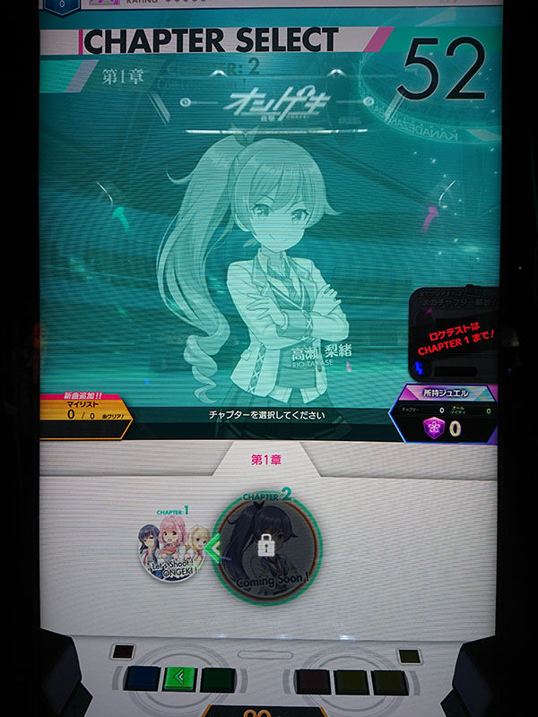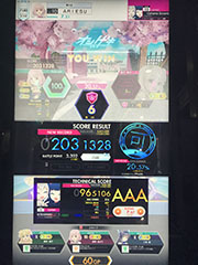 ■おためし会収録楽曲一覧(2018年5月20日追記)2018年5月開催のおためし会では、解禁楽曲含めて19曲確認できました。2017年12月開催のロケテストで収録されていた一部楽曲は、今回のおためし会では確認できませんでした。楽曲選択は、『チュウニズム』同様に横スクロールで選択します。楽曲は、対戦相手毎に用意されています。また対戦相手以外に、ジャンル毎(オリジナル曲・POPS&ANIME・niconicoなど)から楽曲を選択することもできます。 一部楽曲は、ゲーム中に手に入る「ジュエル」を利用して解禁します。