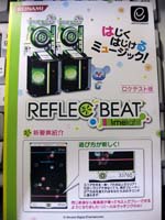2010年11月に新しくBEMANIシリーズに仲間入りとなった『REFLEC BEAT』最新作が登場です。最新バージョンは前作(今作)と比較して、ゲーム性に関する仕様変更が多々見られます。 1. 新システムについて 1.1 スコアが10万点満点になり、7万点以上でクリアに変更 前作(現行バージョン)のように、相手よりスコアが上回っていたら勝利という形式ではなくなりました。jubeatのように、一定以上のスコアに達するとクリアというルールに変更されました。 1.2 HARDに3TOPオブジェクト登場 BASICにも2TOPオブジェクト登場の模様 判定ラインの上にある判定ポイントが前作までは2つでしたが、HARDでは真ん中にひとつ増えて3TOPオブジェクトになりました。MEDIUMはこれまで同様2TOPですが、BASICにも2TOPが追加されました(前作は2TOPなし)。また、TOPオブジェクトにロングオブジェクトが追加されました。緑色のロングオブジェクトが、2TOP・3TOP判定ポイントにめがけて降ってきます。 1.3 隠し解禁システムの変更 曲クリア後のリザルトでプレイ成績に応じて、今作のサブタイトルにもなっている「ライム」が手に入ります。このライムを用意されている「ライムライトのグラス」、もしくは「リフレクビートの筐体」にどちらかに注ぐか選択します(リザルト時に、次のステージ終了時にどっちに注ぐか選択できます)。グラス・筐体ともに一定の高さにラインがひかれていて、ラインに達すると隠し要素が解禁します。「ライムライトのグラス」は、今作の隠し曲が解禁。「リフレクビートの筐体」は、前作の隠し曲(レベルを上げることで解禁できた曲)が解禁する模様です。 今回のロケテストでは前作のデータを引き継いでプレイできるのですが、前作でレベル100まで到達してすべての隠し曲解禁済みであれば、筐体は最初から満タンになっていました。 「ライムライトのグラス」は3つのラインがひかれていて、3つめのラインに到達すると2つめのグラスに移ります。2つめのグラスは4つのラインがひかれていました。ラインに到達するまでの必要なライムの量は、どんどん増えていく模様です。なお「リフレクビートの筐体」は、7つのラインがひかれていました。 2. その他様々な新要素について2.1 パズルツイート楽曲選曲後、対戦相手待ち合わせ中にゲーム機からリフレクのアカウント(@rbllloc)につぶやくことができます。あらかじめ用意されたタンゴを組み合わせて、最大20字内でつぶやくことができます。 ![]() ※実際にゲーム機からつぶやいたものをツイッター上から見た状態です(真ん中のARIESUがそれ)。 2.2 マッチング絵文字 プレイ直前に相手とコミュニケーションをとるための一言ボタンが用意されています。メッセージを選択して、相手に送ることができます。 2.3 お気に入り登録 オンラインプレイでいっしょにプレイしたプレーヤーをお気に入り登録ができます。 2.4 ガイド機能 前作に収録されていた「カラフルミニッツ」のジャケットに登場したねずみさんが遊び方をガイドしてくれます。@rblllocのアイコン絵のねずみさんです。 2.5 選曲画面が横スライド式に 50音順に並べられていて、画面上にボタンがありますのでソートも可能です。今回は新曲のところに目印といったようなものがなかったので、やや探しづらかったような…。 2.6 オススメ楽曲 選曲画面下に今日のオススメ楽曲が表示されるようになりました。オススメ楽曲をプレイすると、獲得ポイントが他より多めにもらえるようです。 2.7 ローカルプレイで難易度別マッチングが可能に 前作では不可能だった難易度別マッチングですが、ローカルプレイ限定で可能となりました。 ![]() ※店舗に置いてあった新要素を説明したガイドです(両面で1枚)。 3. 新曲について ライセンス曲は、AKB48の原曲(BEMANIシリーズ以外他社のを含めても原曲は初)やゴールデンボンバー、ナオト・インティライミなど、人気アーティスト曲が収録されています。 コナミオリジナル曲は、デフォルト収録をみても村井聖夜さん・TЁЯRA・S-C-U(ショッチョー)の新曲が用意されていました。