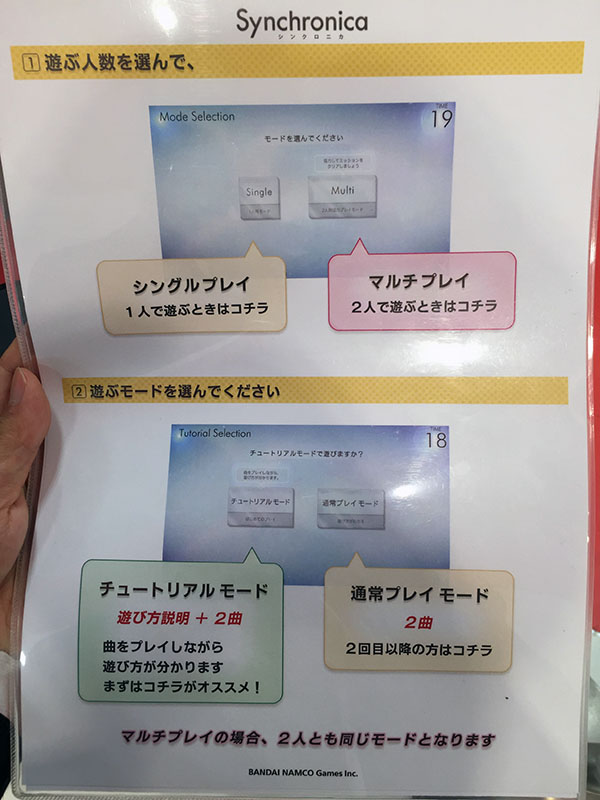 最初のチュートリアルは、シングルプレイを中心としたゲームの基本的な説明後、1曲目をプレイできます。2曲目の前にマルチプレイの説明が入り、シングルプレイの場合はCPUといっしょにマルチプレイで2曲目が遊べます。「通常プレイモード」は、2曲プレイできます。1曲目から全曲・全難易度選択できます。2回目のプレイ以降はゲームモード選択画面は表示されず、選曲画面に移行します