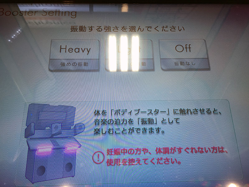 - 初回プレイ時、筐体正面についている「ボディブースター」の振動の強さを3段階から調整します。
