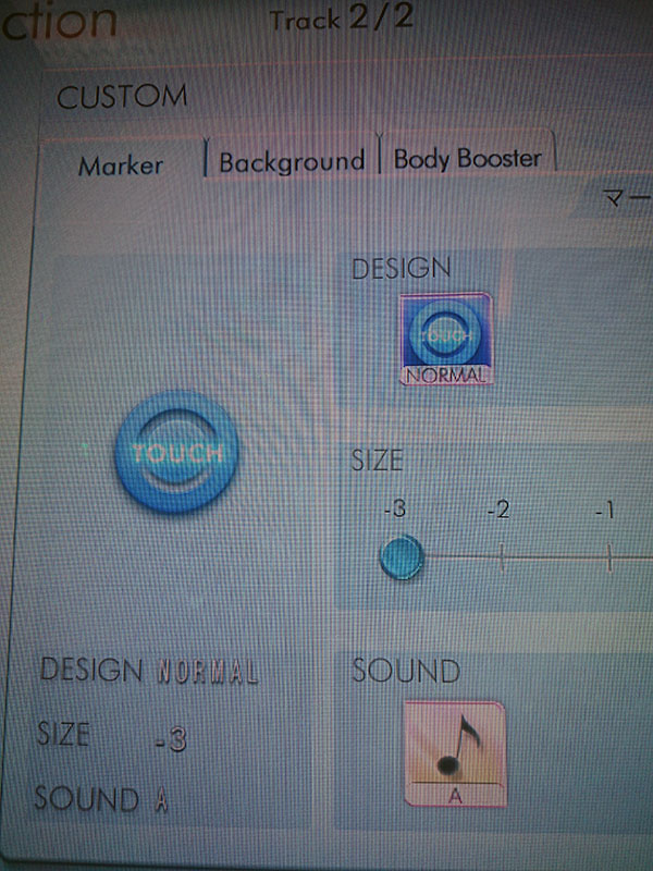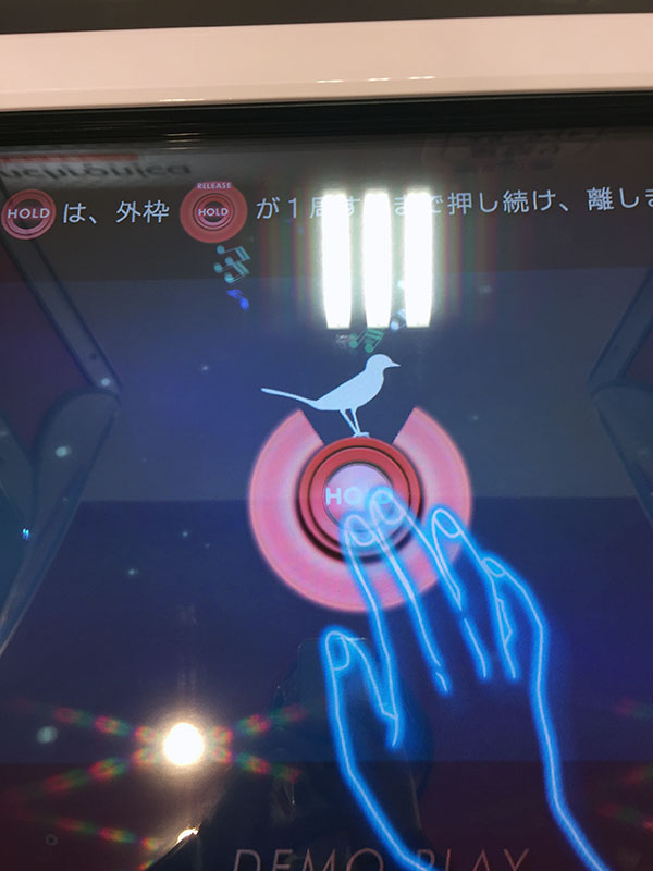 32インチサイズ(※)の大型モニターを使用。画面に表示される各種マーカーをタッチして遊ぶ音楽ゲームです。ただマーカーをタッチするだけの音楽ゲームではなく、譜面の難易度が上がっていくと指で奏でるような譜面が登場し、音と指との一体感が存分に楽しめる音楽ゲームです。
