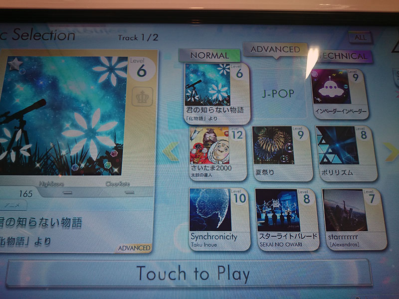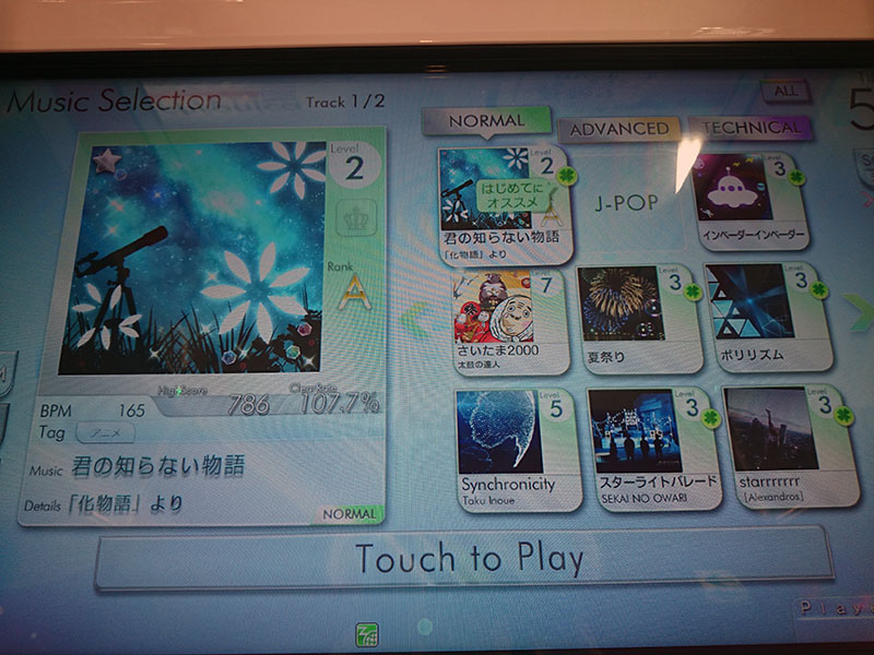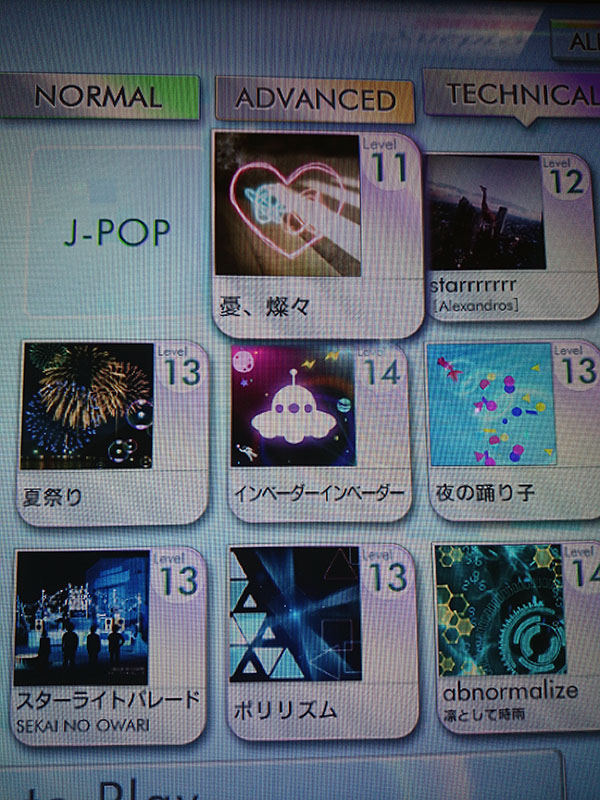 - 選曲画面からプレイする楽曲・難易度を選択します。難易度変更は、楽曲選択後も変更できます。難易度は3段階(NORMAL・ADVANCED・TECHNICAL)から選択します。
