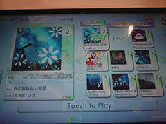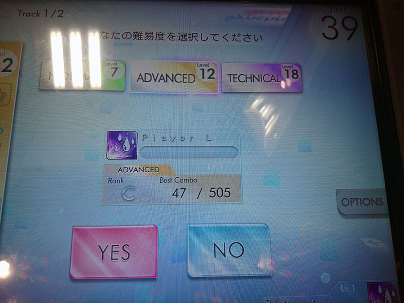 なお、楽曲選択して難易度を変更するところで、画面右側をみると「OPTION」がありましたが、今回のバージョンではタッチしても反応ありませんでした。