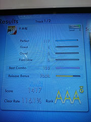 リザルト画面では、判定数・ベストコンボ・リザルトボーナス・スコア・クリアレート・ランクが表示されます。